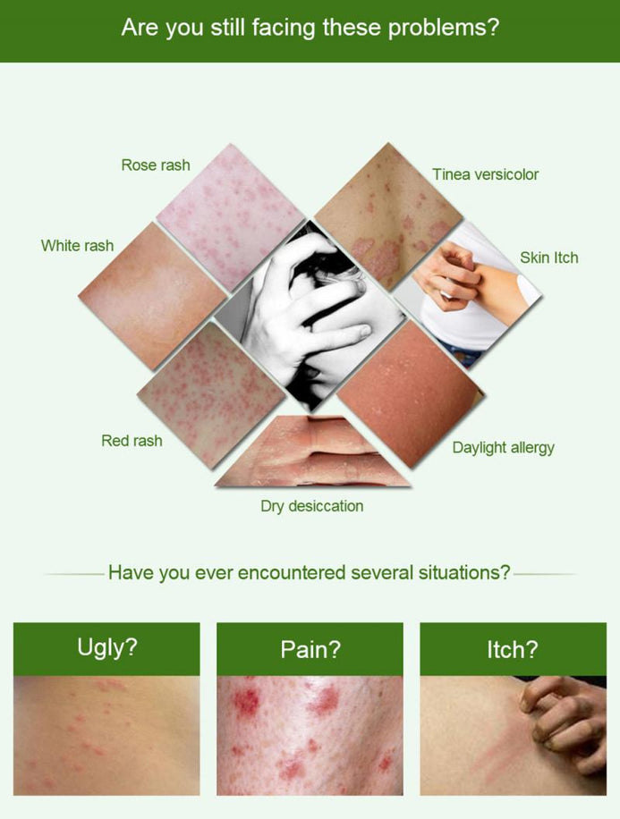 Psoriasis, Eczema, Rosacea, Acute and Chronic Dermatitis, Neurodermatitis, Acute and Chronic Eczema, Atopic Dermatitis, Urticaria, Tinea (Athlete's Foot, Liriodendron Wind), Jock Itch Body, Sweat Stain, Bad Feet, Feet Peeling, Blisters, Itchy Feet Genital Itching, Anal Itching, Hemorrhoids, Insect Bites, Acne, Prickly Heat, Skin Itching.