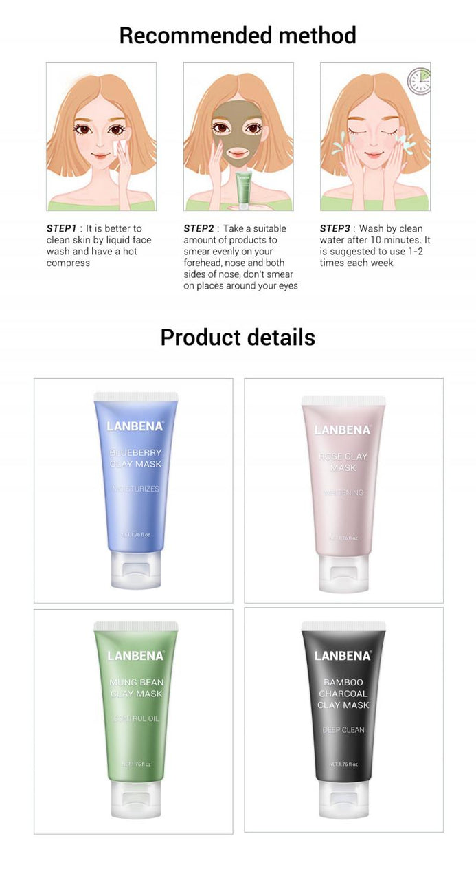 The LANBENA Bamboo Charcoal Clay Mask contains natural bamboo charcoal extracts which have a strong adsorption capacity and can deep clean dirt from the pores, absorb oil and remove blackheads. The light and thin mineral clay can effectively clean the pores, remove grease, deep cleaning and oil controlling, make skin firming and shrink the pores.